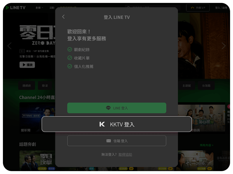 在 LINE TV 登入頁面選擇「KKTV 登入」,按照步驟完成授權登入。